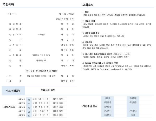 중서부한미 노회 여서교회 모임이 4월 12일(오늘) 오후 4시, 베다니 장로 교회에서 있습니다. (4707 W Partt Ave, Lincolnwood, IL, 60712)