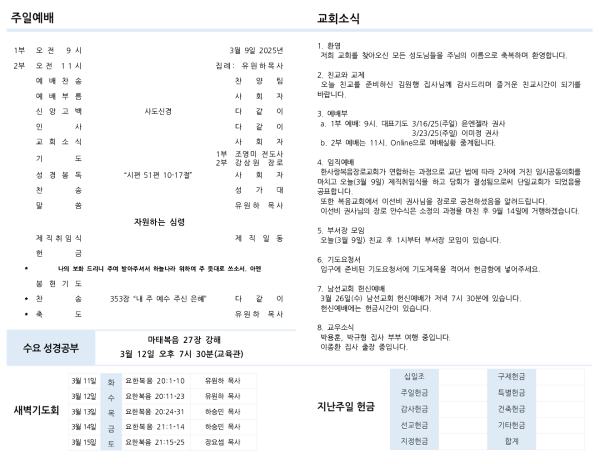 a. 1부 예배: 9시. 대표기도 3/16/25(주일) 윤엔젤라 권사