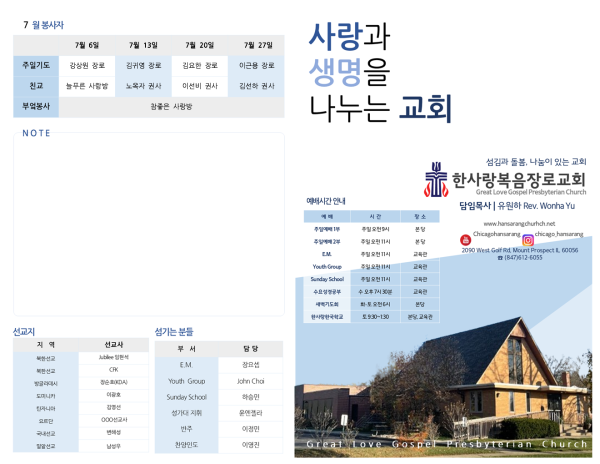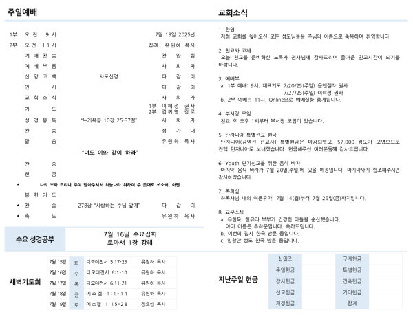 a. 1부 예배: 9시. 대표기도 7/20/25(주일) 윤엔젤라 권사