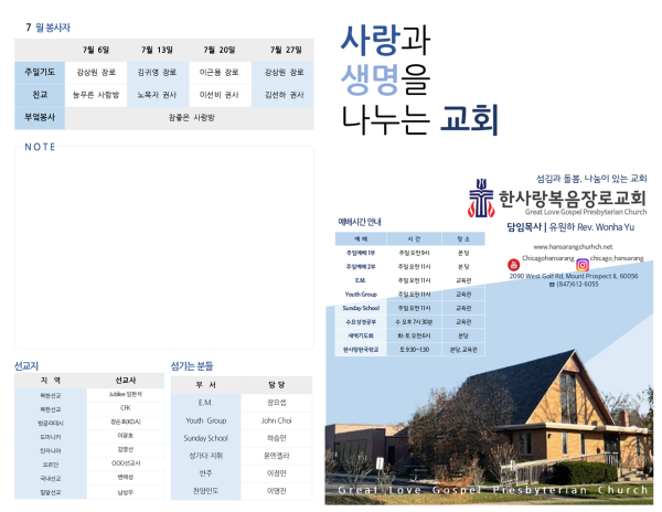 하목사님 내외 여름 휴가 7월 25일(금)까지입니다.
