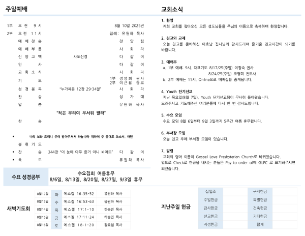 a. 1부 예배: 9시. 대표기도 8/17/25(주일) 이정숙 권사