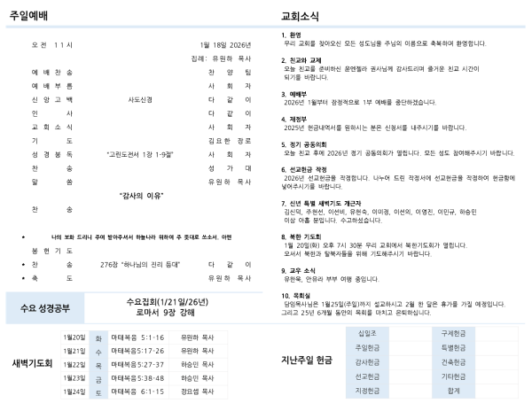 오늘 친교 후에 2026년 정기 공동의회가 열립니다. 모든 성도 참여해주시기 바랍니다.