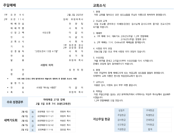 a. 1부 예배: 9시. 대표기도 2/9/25(주일) 1,2부 연합예배