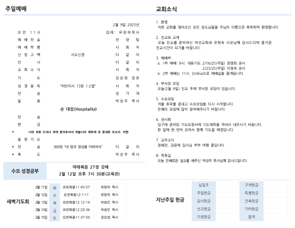 a. 1부 예배: 9시. 대표기도 2/16/25(주일) 정영희 권사