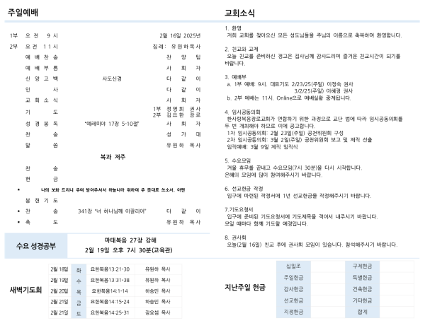 a. 1부 예배: 9시. 대표기도 2/23/25(주일) 이정숙 권사