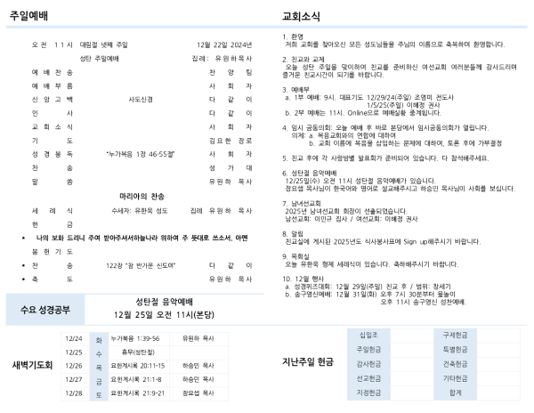 2024년 12월 22일 주보 페이지 정보 작성자 최고관리자 댓글 0건 조회 2,033회 작성일 24-12-21 05:46 본문 2024년 12월 22일 주보 SNS 공유 목록 이전글2024년 12월 29일 주보 24.12.29 댓글목록 댓글목록 등록된 댓글이 없습니다.
