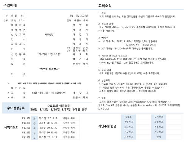 따라서 8/24일 주일은 1,2부 합동예배로 드리겠습니다.