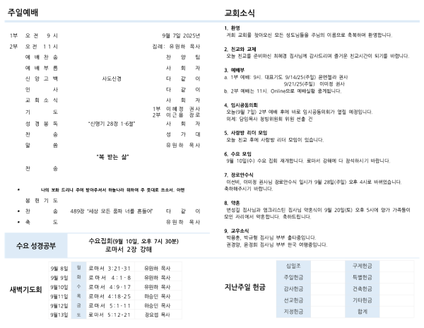 a. 1부 예배: 9시. 대표기도 9/14/25(주일) 윤엔젤라 권사