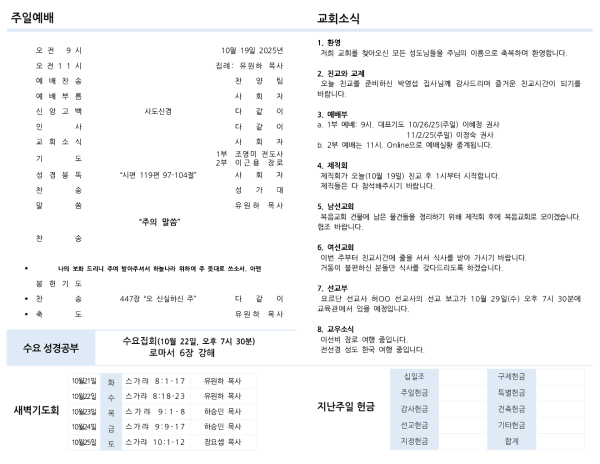 b. 2부 예배는 11시. Online으로 예배실황 중계됩니다.