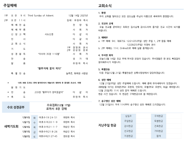 a. 1부 예배: 9시. 대표기도 12/21/25(주일) 성탄 주일 1, 2부 합동 예배