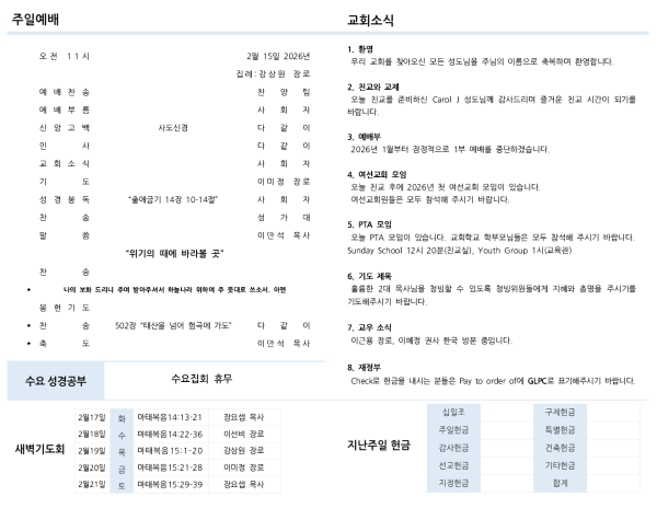 Check로 헌금을 내시는 분들은 Pay to order of에 GLPC로 표기해주시기 바랍니다.
