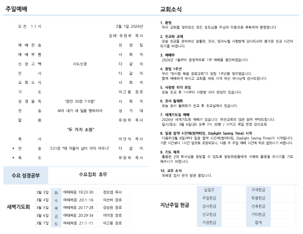 다음주(3월 8일)부터 일광 절약 시간제(썸머타임, Daylight Saving Time)가 시작됩니다. 기존 시간보다 1시간 앞으로 조정되오니, 다음 주 주일 예배 시간에 착오 없으시기 바랍니다.