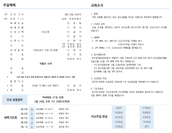 a. 1부 예배: 9시. 대표기도 3/2/25(주일) 이혜정 권사
