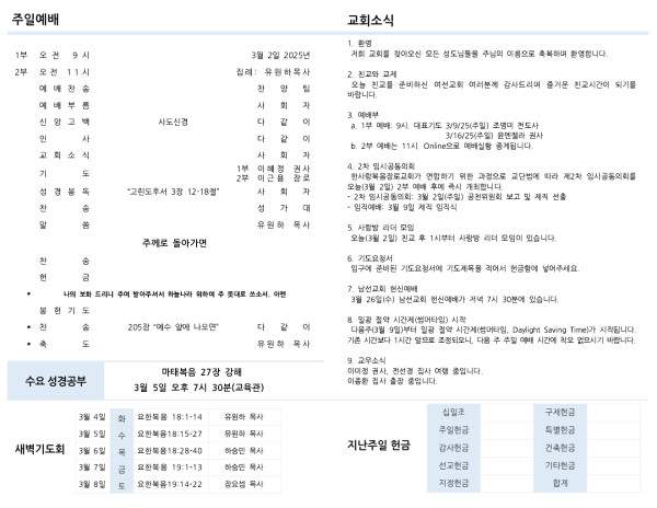 a. 1부 예배: 9시. 대표기도 3/9/25(주일) 조영미 전도사