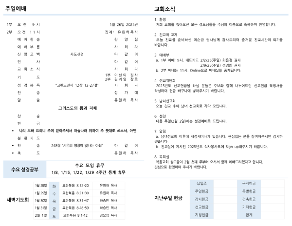 a. 1부 예배: 9시. 대표기도 2/2/25(주일) 최은경 권사
