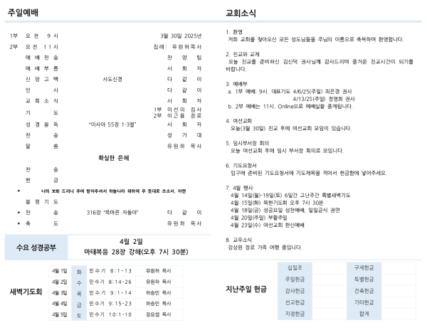 a. 1부 예배: 9시. 대표기도 4/6/25(주일) 최은경 권사
