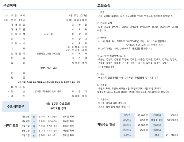 a. 1부 예배: 9시. 대표기도 5/4/25(주일) 오전 11시 1,2부 연합예배