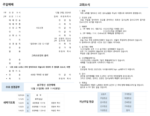 2024년 12월 29일 주보 페이지 정보 작성자 최고관리자 댓글 0건 조회 2,003회 작성일 24-12-29 05:06 본문 2024년 12월 29일 주보 SNS 공유 목록 이전글2025년 1월 5일 주보 25.01.07 다음글2024년 12월 22일 주보 24.12.21 댓글목록 댓글목록 등록된 댓글이 없습니다.