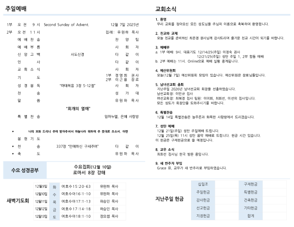 a. 1부 예배: 9시. 대표기도 12/14/25(주일) 이정숙 권사