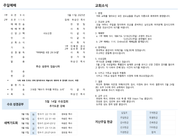 a. 1부 예배: 9시. 대표기도 5/18/25(주일) 조영미 전도사