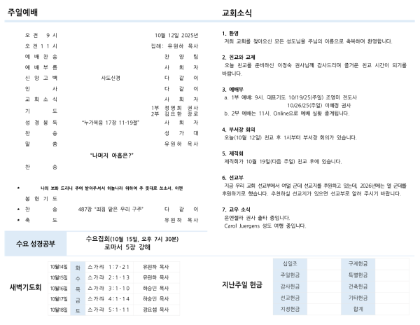 a. 1부 예배: 9시. 대표기도 10/19/25(주일) 조영미 전도사