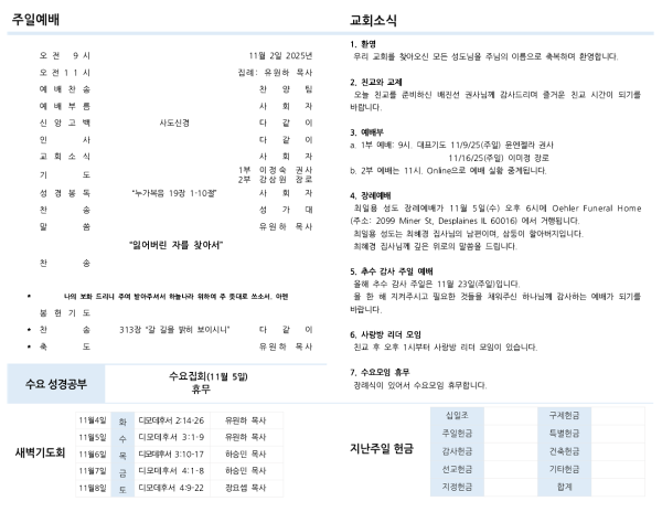 a. 1부 예배: 9시. 대표기도 11/9/25(주일) 윤엔젤라 권사