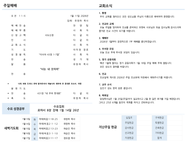 2026년 1월부터 잠정적으로 1부 예배를 중단하겠습니다.