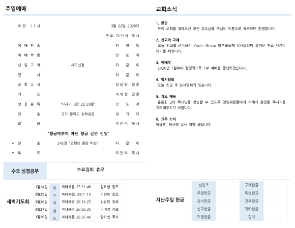 우리 교회를 찾아오신 모든 성도님을 주님의 이름으로 축복하며 환영합니다.